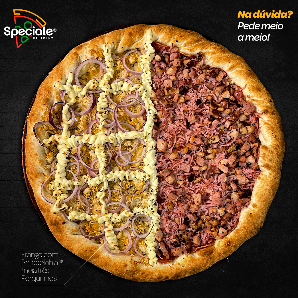 Molho de tomate, Mussarela mineira, Camarão altamente selecionado, Cream Cheese Philadelphia® (Original), finalizado com molho Tarê Speciale, um toque de cebolinha e orégano.